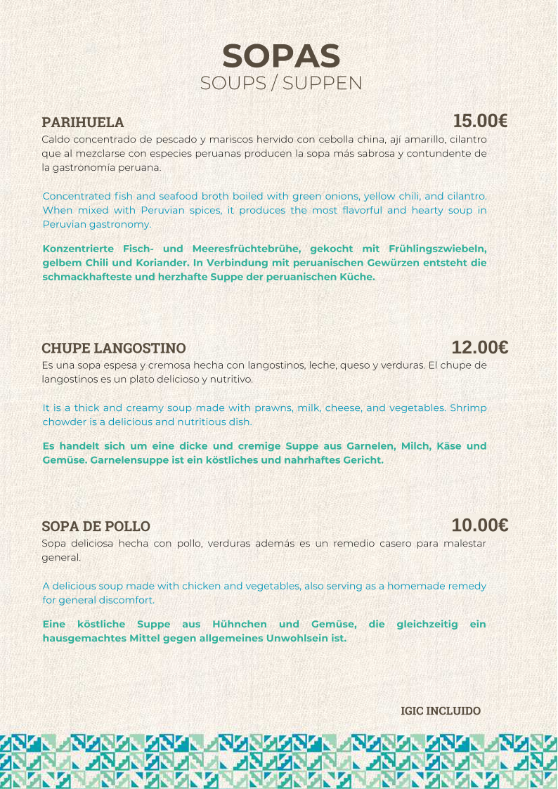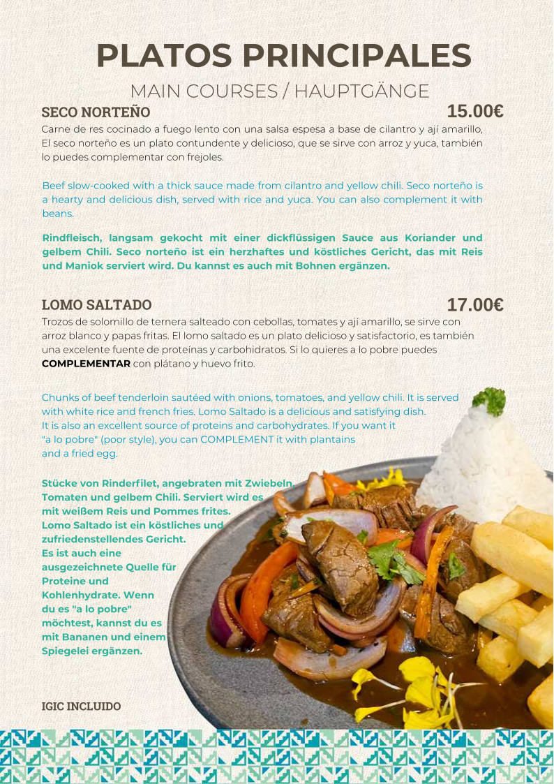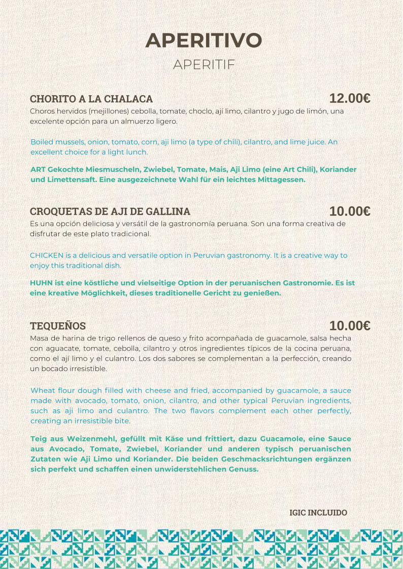 Guests can savor fresh, vibrant starters like the Causa de Pollo or Papas a la Huancaína, which balance bright, citrusy notes with hearty textures. Soups such as the rich Parihuela provide a satisfying warmth, perfect for settling in. The menu also highlights classic mains like Pollo a la Brasa and Chaufa de Carne, offering accessible and filling options that reflect the soul of Peruvian home cooking.