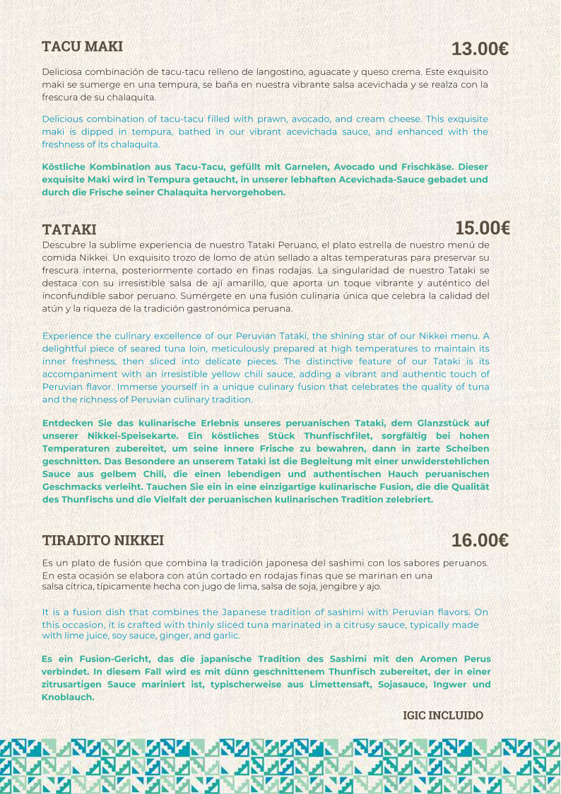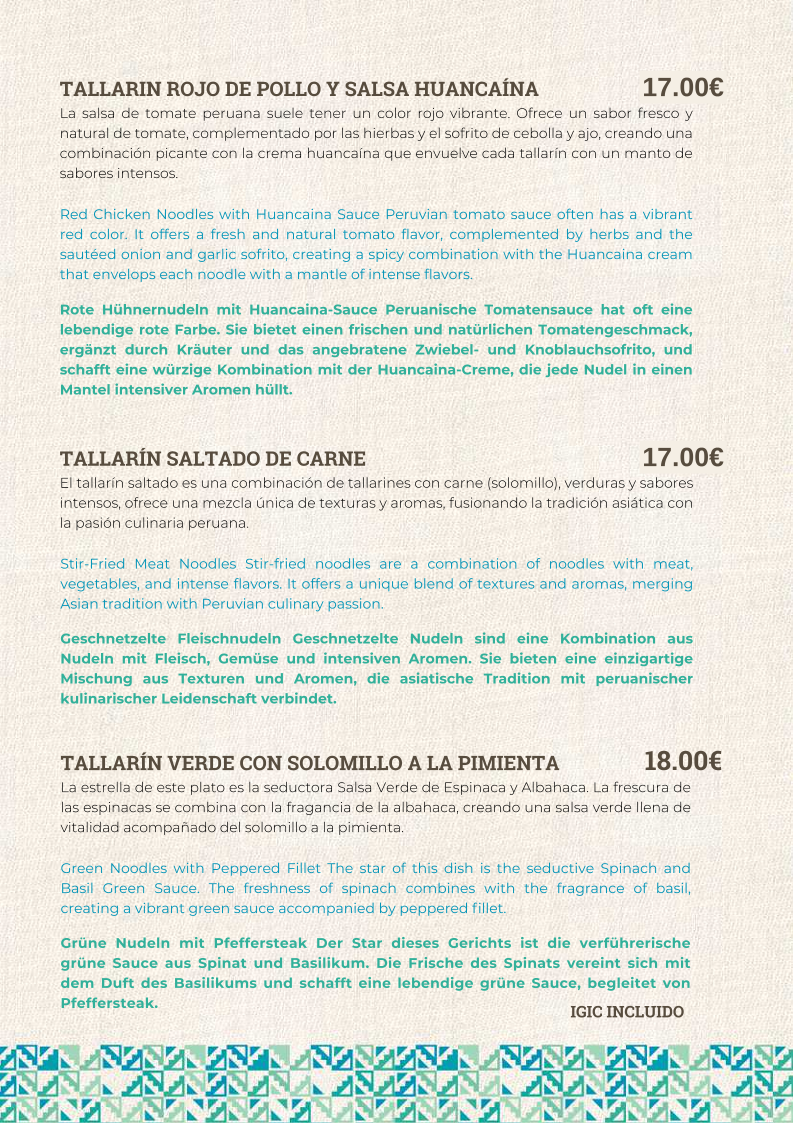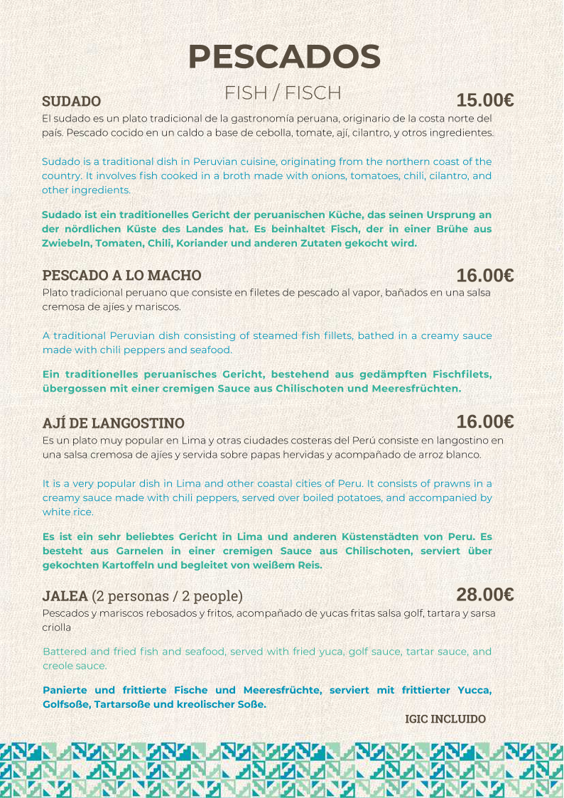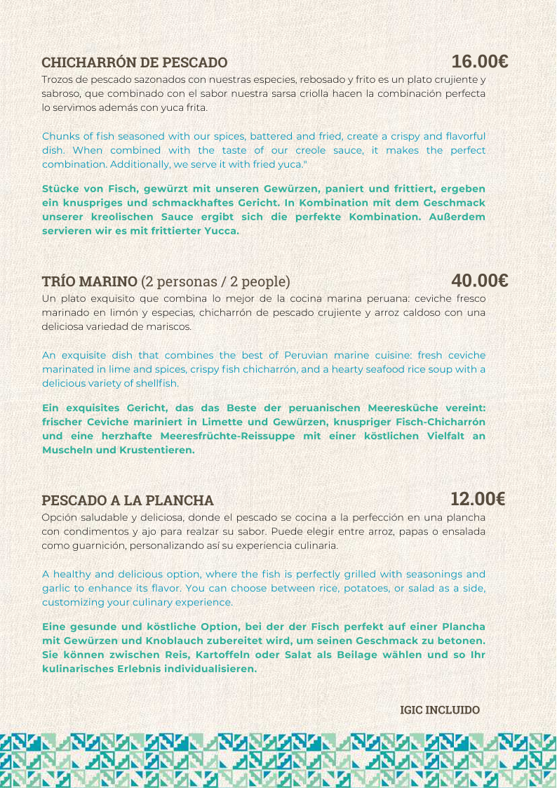 Guests can savor fresh, vibrant starters like the Causa de Pollo or Papas a la Huancaína, which balance bright, citrusy notes with hearty textures. Soups such as the rich Parihuela provide a satisfying warmth, perfect for settling in. The menu also highlights classic mains like Pollo a la Brasa and Chaufa de Carne, offering accessible and filling options that reflect the soul of Peruvian home cooking.